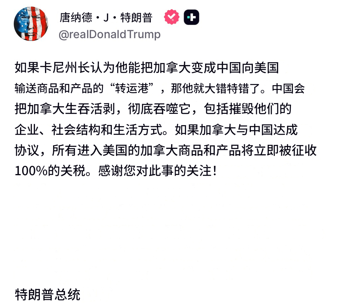 特朗普在其社交平台“真实社交”上发文称,不会允许加拿大成为中国商品进入美国市场的“中转站”。特朗普还警告,中国可能会“把加拿大整个吞食”,并称这将严重破坏加拿大的企业体系、社会结构及整体生活方式。