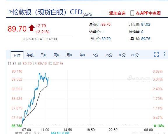 截至1月14日发稿,现货白银报89.70美元/盎司,涨3.21%。