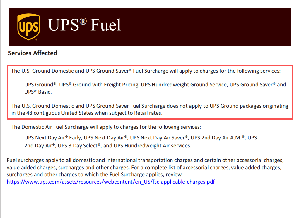 如果客户老爷们是在美国本土48州使用Retail rates(零售价)发货,是不收这个燃油费的 。但我们账号业务的客户都是走Wholesale/Contract rates(协议价),所以会受到影响。