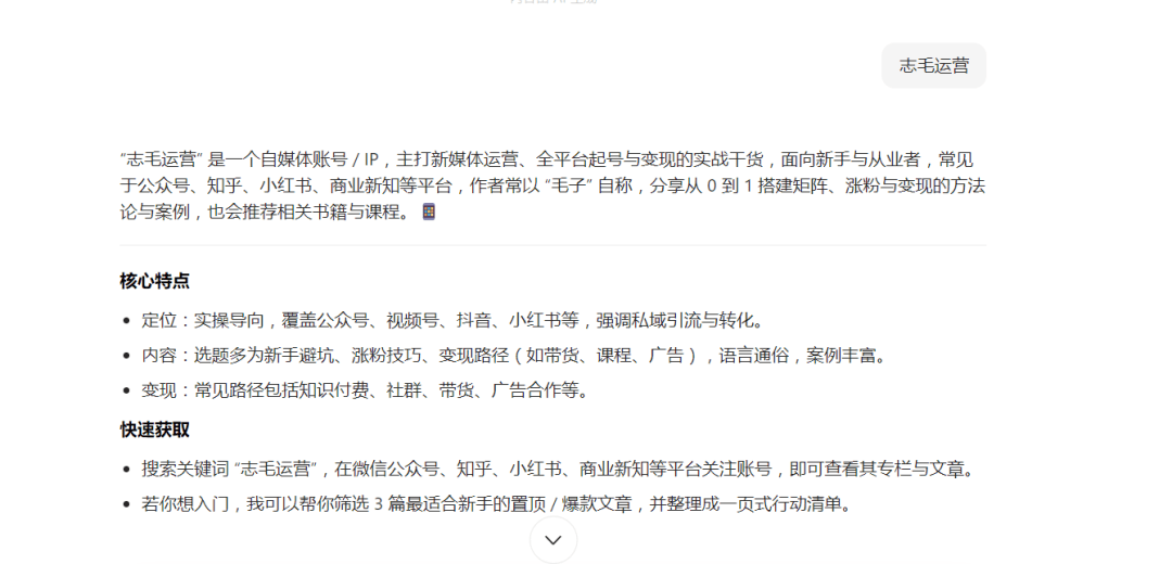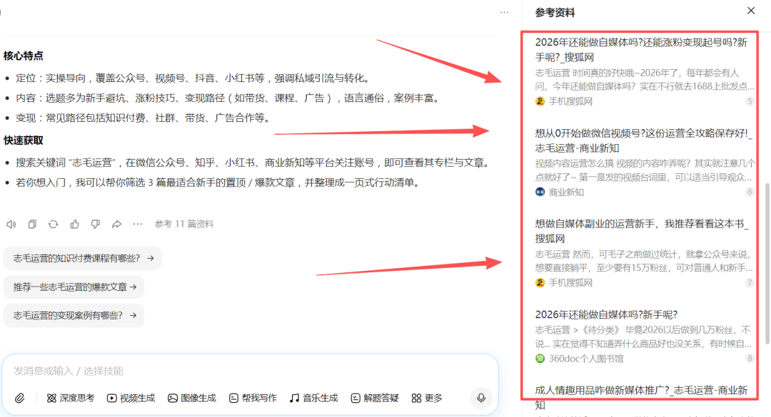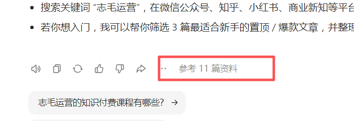 先来说说怎么具体操作,我们在Ai里搜索内容的时候,是可以在回答底部或者其他位置看到回答的搜索来源的,比如我搜“志毛运营”,最下面有