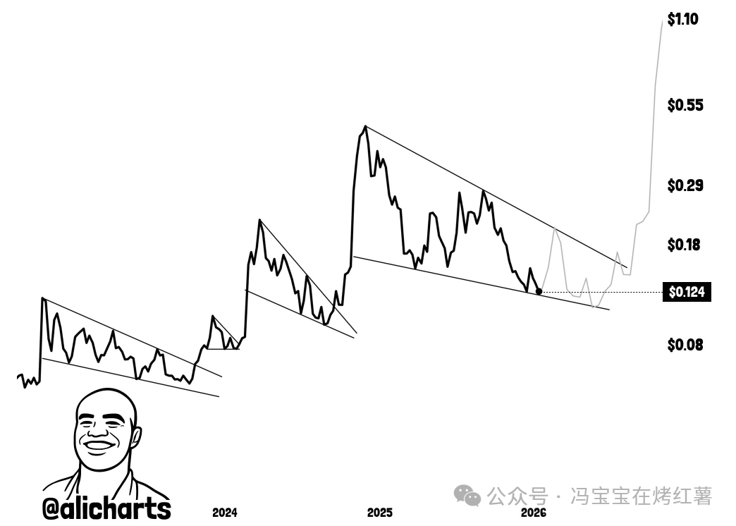 值得注意的是,从历史表现来看,狗狗币曾多次走出类似的楔形整理,随后均迎来向上突破,并开启一段上涨行情。而当前这个楔形,从时间跨度和幅度上看,是近期规模最大的一次。