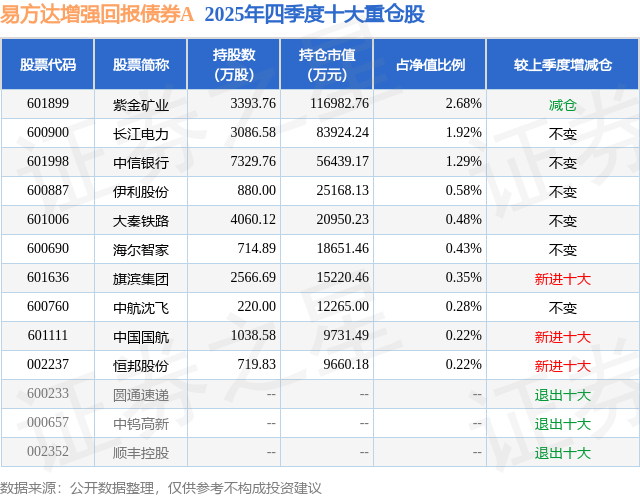 根据2025基金年报公募基金重仓股数据,重仓该股的公募基金共9家,其中持有数量最多的公募基金为易方达基金的易方达增强回报债券A。易方达增强回报债券A目前规模为316.96亿元,最新净值1.406(1月23日),较上一交易日上涨0.0%,近一年上涨5.95%。该公募基金现任基金经理为王晓晨。王晓晨在任的基金产品包括:易方达投资级信用债债券A,管理时间为2013年9月10日至今,期间收益率为77.65%;易方达裕祥回报债券A,管理时间为2022年4月30日至今,期间收益率为21.17%;易方达安泽180天持有期债券A,管理时间为2024年1月24日至今,期间收益率为5.59%。
