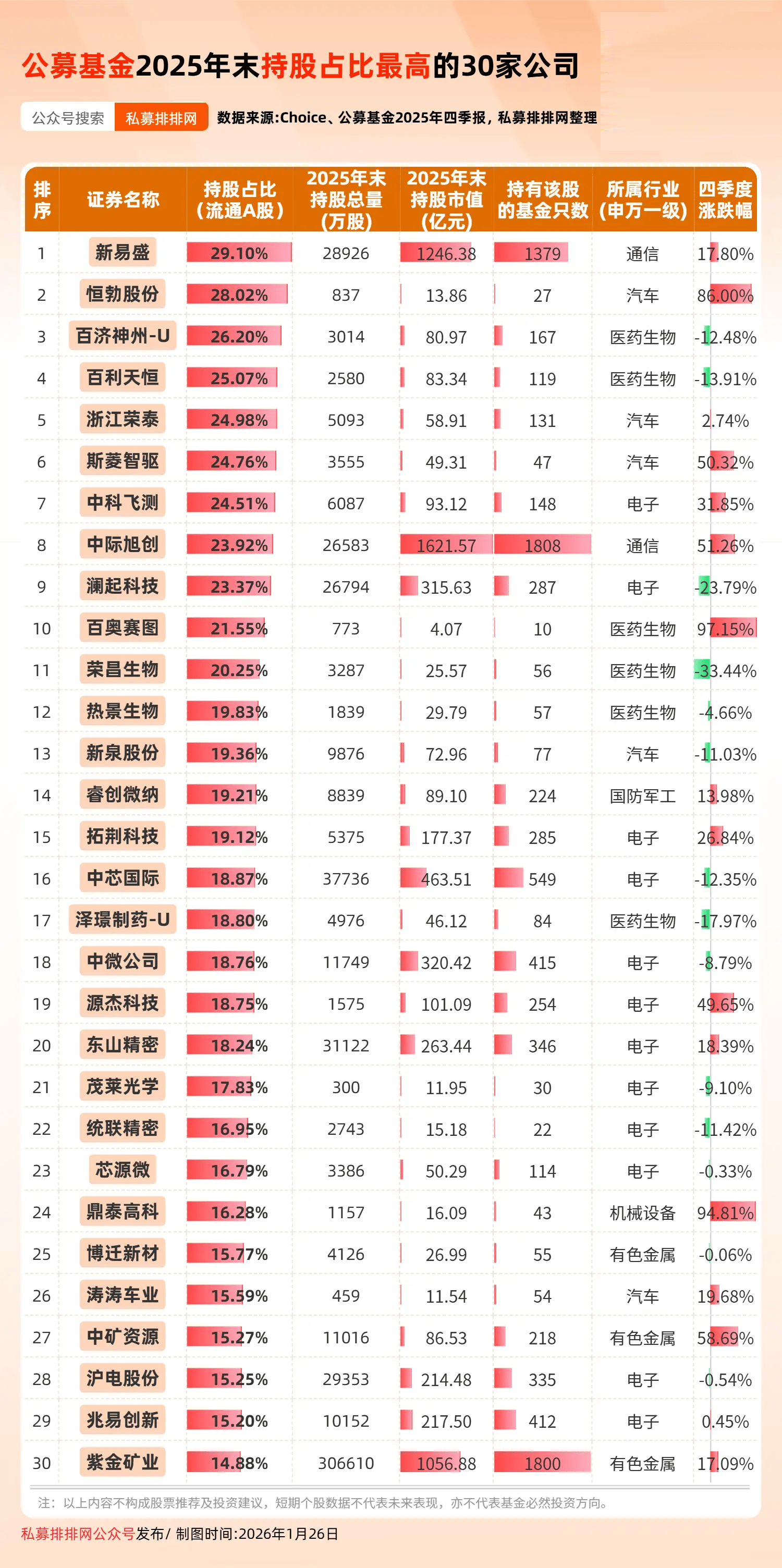 从公募基金持股占A股公司的流通股比例来看,2025年末,公募基金持股比例达到10%以上的公司有94家。为了给读者提供一些参考,笔者梳理出了公募基金持股占比最高的30家公司。其中,电子行业占12家,医药生物行业占6家,汽车行业占5家。