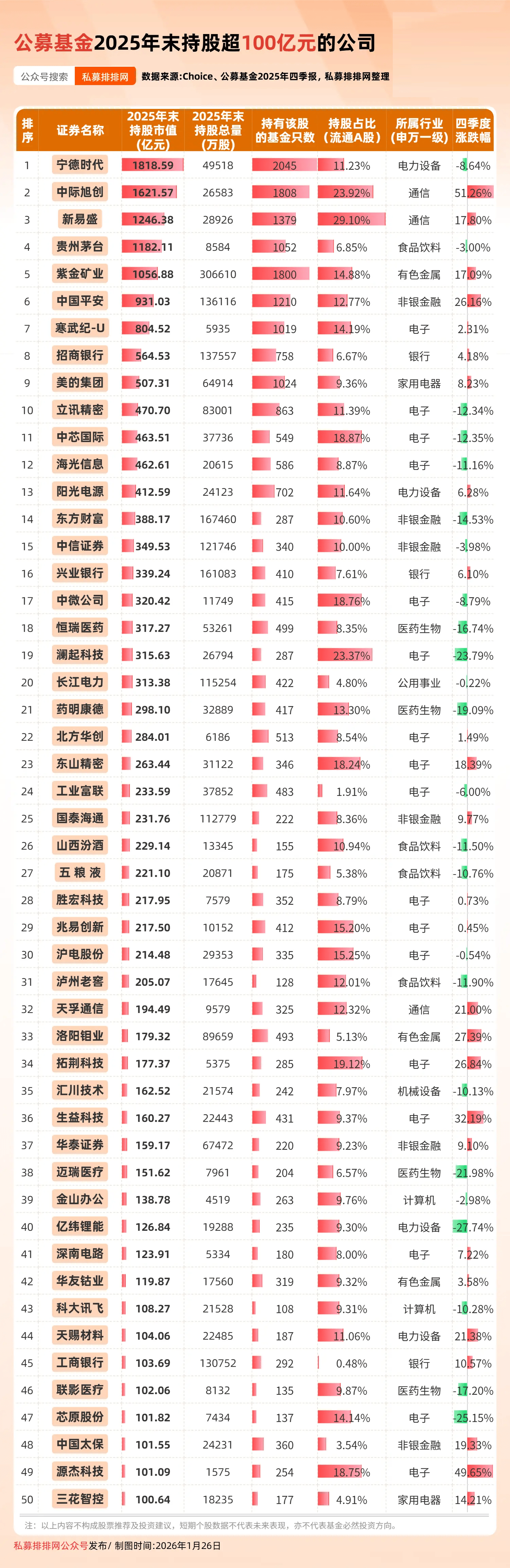 50家公司被基金持股超百亿,中际旭创、新易盛超越茅台