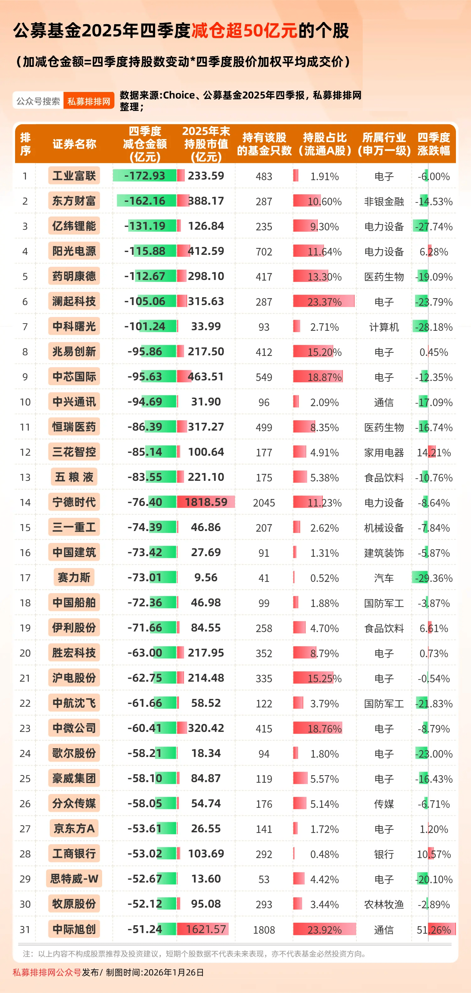 此外,2025年四季度,被基金减仓金额超50亿元的公司有31家。其中,电子行业占11家。工业富联、东方财富、亿纬锂能、阳光电源、药明康德、澜起科技、中科曙光等7股均被基金减仓超100亿元。
