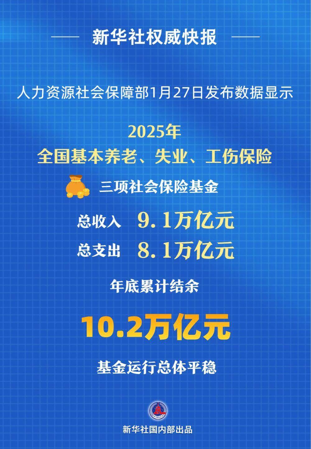 人力资源社会保障部1月27日发布数据显示,截至2025年底,全国基本养老、失业、工伤保险参保人数分别为10.76亿人、2.49亿人、3.05亿人,分别比上年底增加316万人、329万人、102万人。全年三项社会保险基金总收入9.1万亿元、总支出8.1万亿元,年底累计结余10.2万亿元,基金运行总体平稳。