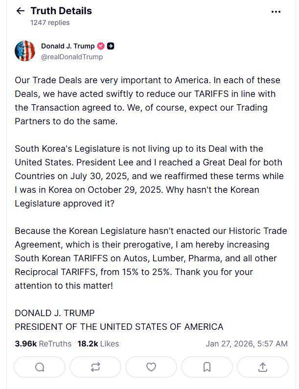 特朗普表示,鉴于韩国方面尚未通过该项“具有历史意义的贸易协议”,他已决定将对韩国汽车、木材、制药产品以及其他对等关税项目的税率从15%上调至25%。