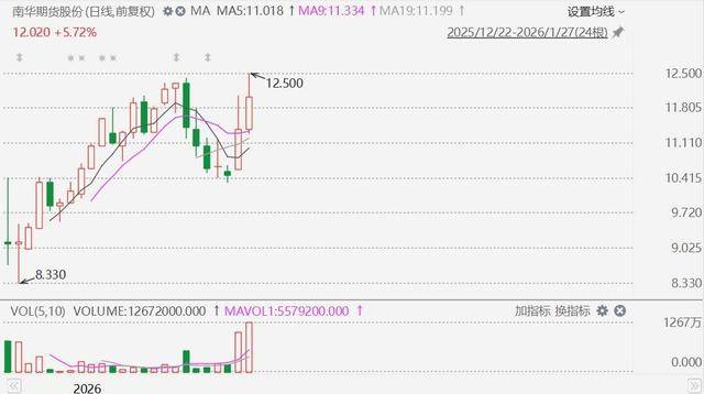 延续昨日涨势,南华期货股份(2691.HK)今日盘中再度涨近10%至12.5港元,股价创上市新高。消息面上,1月19日,南华期货股份获纳入港股通。另外,南华期货近日在互动平台回答投资者提问时表示,公司境内外经纪业务、场外衍生品业务等相关业务涉及黄金、白银等期货品种。华西证券此前指,公司期货业务牌照齐全,全球化布局成效显著,境外业务具备优势,将继续作为公司业务的主要抓手,帮助公司实现快速发展。