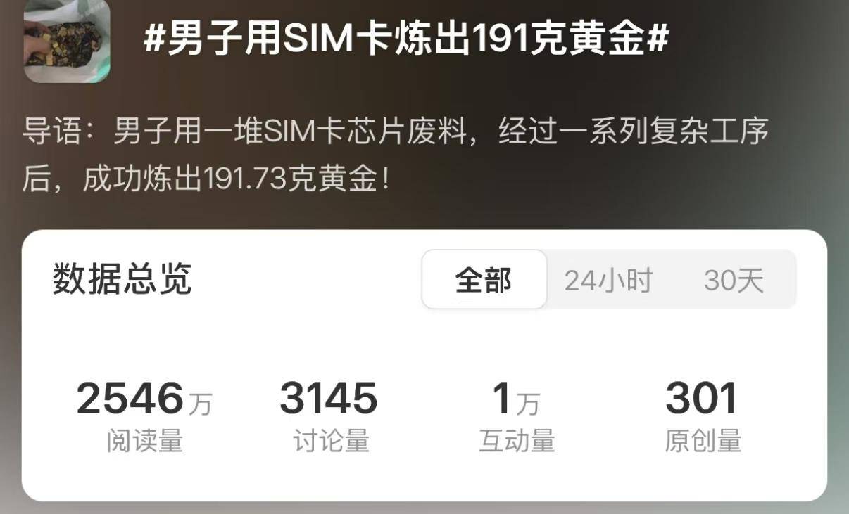 近日,“男子用 SIM 卡炼出 191.73 克黄金”的话题冲上热搜,引发了广泛关注。当事人后期接受采访称,为了保证良好的稳定性和耐腐蚀性,SIM卡会在芯片引脚与电路板的连接处等关键部位进行镀金处理。除了SIM卡芯片,银行卡芯片、IC卡、电子元件、通讯设备接触件等都属于可回收含金废料。