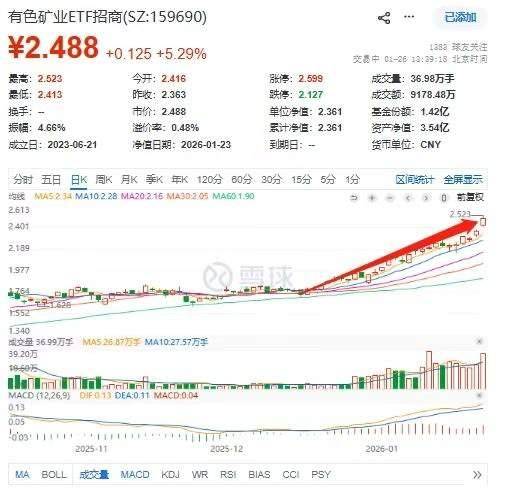 1月26日,有色集体爆发!数据显示,截至13时35分,有色矿业ETF招商(159690)放量涨5.21%,一度涨6.77%;成分股白银有色、中钨高新、兴业银锡涨停,湖南白银、中金黄金涨幅居前。
