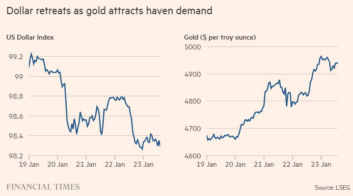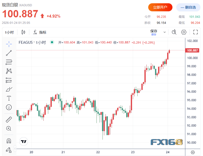 FX168财经报社(北美)讯 周五(1月23日),贵金属市场再度上演强势拉升:现货白银盘中首次站上101美元/盎司上方,刷新历史纪录;黄金同步再创高点,向5000美元/盎司整数位发起冲击。在投资者对避险配置的需求显著升温之际,“去美元化”叙事与降息预期共同放大了资金对硬资产的追逐。