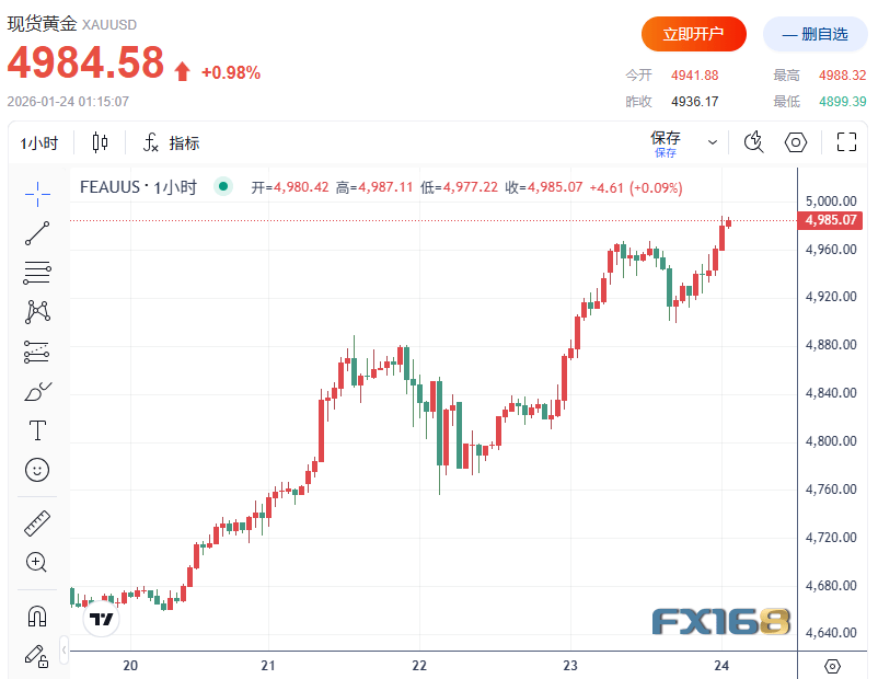 现货黄金盘中刷新纪录高位后维持强势,继续逼近5000美元关口。