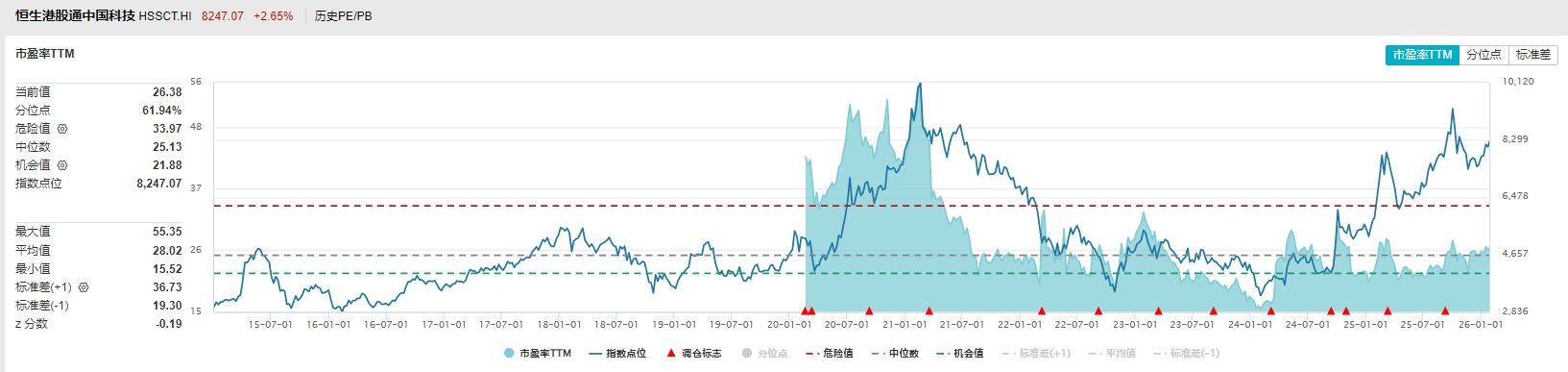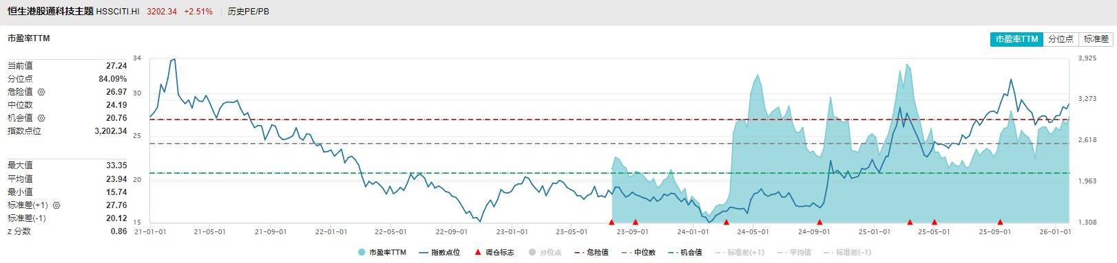 最后再对比两个指数的估值水平,wind数据显示,恒生港股通科技主题指数目前的市盈率TTM位于历史80%以上分位,属于较高位置,而恒生港股通中国科技指数目前的市盈率TTM位于历史60%左右分位,属于中等偏上的位置。