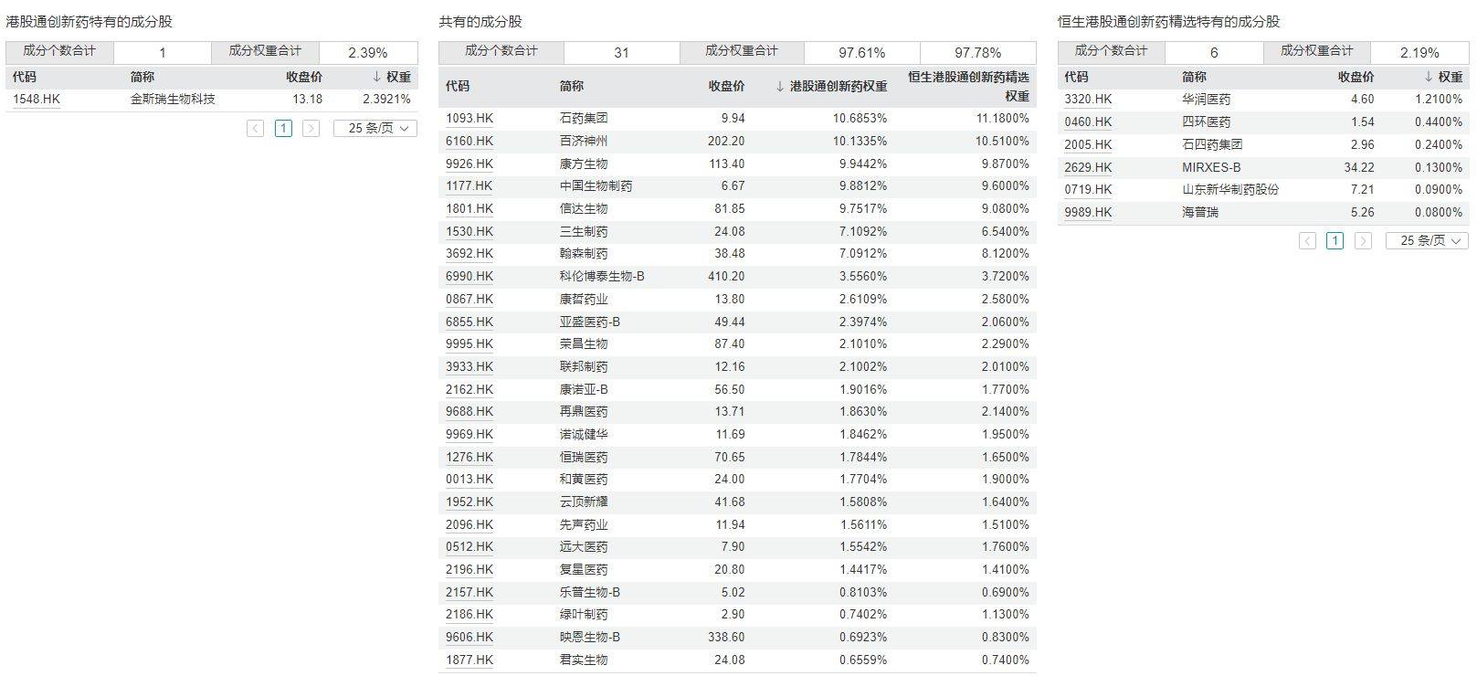 进一步对比两个指数的成分股,可以发现重合的成分股有31只,国证港股通创新药指数独有的成分股有1只——金斯瑞生物科技,恒生港股通创新药精选指数独有的成分股有6只,包括了华润医药、四环医药等。