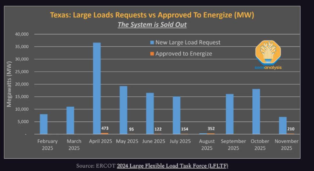 德州ERCOT为例,2024—2025年间,数据中心提交的新增负荷申请规模高达数十GW,但同期真正获批并成功接入的新增负荷,仅约1GW。对于美国来说,电网并非没有电,而是慢到无法匹配AI的节奏。