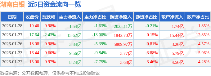 证券之星消息,截至2026年1月28日收盘,湖南白银(002716)报收于19.4元,上涨9.98%,涨停,换手率21.68%,成交量503.97万手,成交额94.16亿元。
