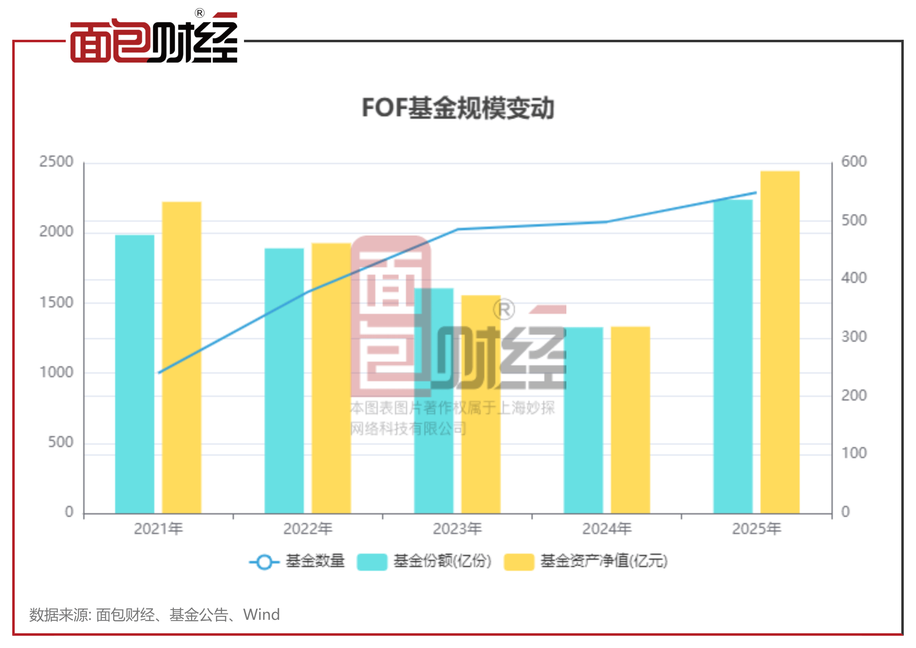Wind数据显示,截至2025年末,FOF基金总份额达到2236.98亿份,基金资产净值达到2441.88亿元。
