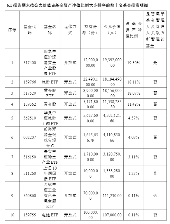 近期披露的2025年四季报显示,国泰优选领航一年持有期混合(FOF)的基金投资金额占基金总资产的比例为72.45%,基金重仓投资黄金ETF,前十大基金持仓中包括国泰中证沪深港黄金产业股票ETF、黄金股ETF等。