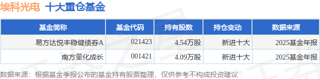 根据2025基金年报公募基金重仓股数据,重仓该股的公募基金共2家,其中持有数量最多的公募基金为易方达基金的易方达悦丰稳健债券A。易方达悦丰稳健债券A目前规模为4.45亿元,最新净值1.0954(1月28日),较上一交易日上涨0.27%,近一年上涨6.36%。该公募基金现任基金经理为张雅君。张雅君在任的基金产品包括:易方达磐恒九个月持有混合A,管理时间为2020年8月7日至今,期间收益率为14.25%;易方达宁易一年持有混合A,管理时间为2021年4月9日至今,期间收益率为10.99%;易方达稳泰一年持有混合A,管理时间为2021年4月27日至今,期间收益率为17.3%;