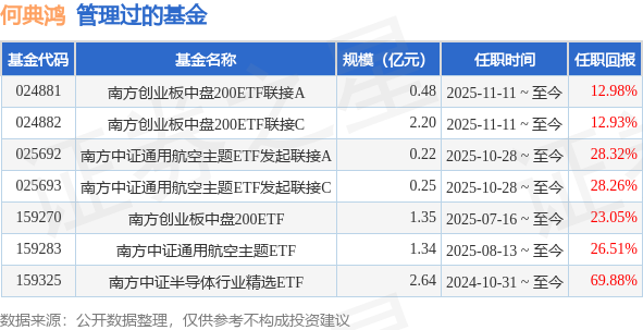 何典鸿先生:北京大学软件工程专业硕士,具有基金从业资格。曾就职于世纪天源环保技术有限公司、魔百创娱科技有限公司、嘉实基金、泰康资管,历任研发部研发工程师、指数投资部量化研究员、公募投资部量化投资高级经理。2021年9月加入南方基金,任指数投资部研究员;2022年12月12日至2024年10月31日,任投资经理;2024年10月31日至今,任南方中证半导体行业精选ETF基金经理;2025年7月16日至今,任南方创业板中盘200ETF基金经理;2025年8月13日至今,任南方中证通用航空主题ETF基金经理。