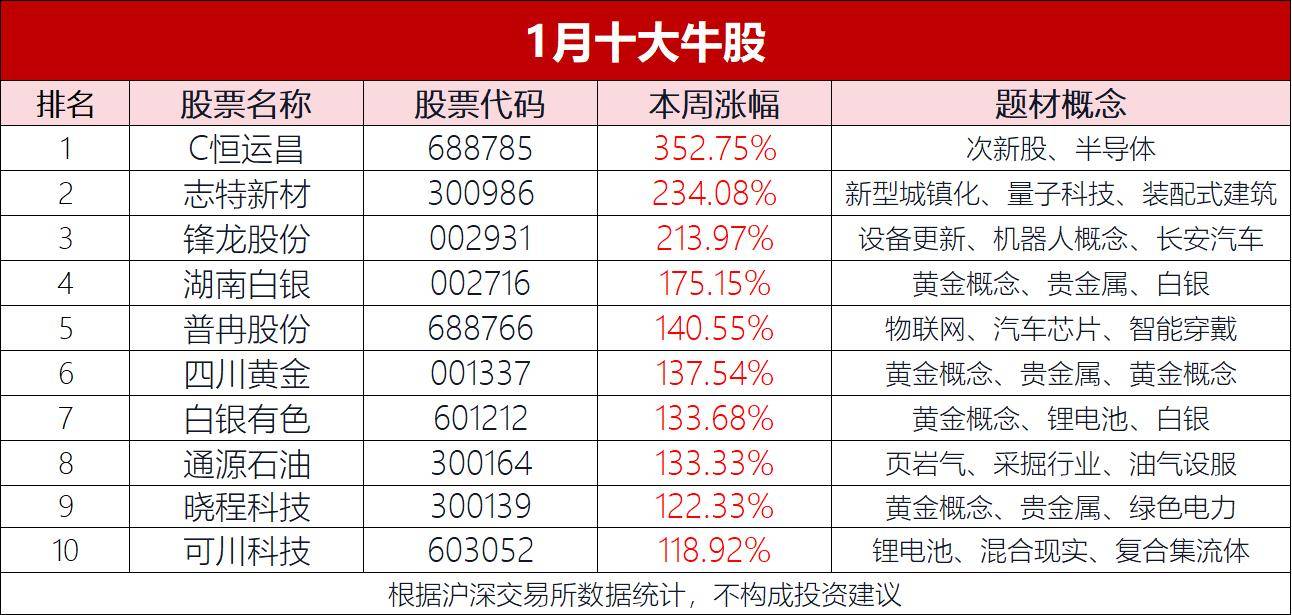 1月十大牛股如下:C恒运昌、志特新材、锋龙股份、湖南白银、普冉股份、四川黄金、白银有色、通源石油、晓程科技、可川科技。
