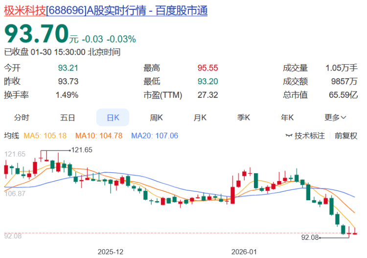 极米科技报收93.70元,日涨幅-0.03%,换手率1.49%,月涨幅-15.95%,今年以来涨幅-15.95%。