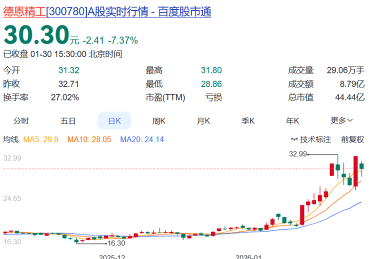 德恩精工报收30.30元,日涨幅-7.37%,换手率27.02%,月涨幅57.16%,列川股第二,今年以来涨幅57.16%。