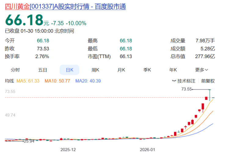 四川黄金报收66.18元,日涨幅-10.00%(跌停),换手率2.76%,月涨幅137.54%,列川股第一,今年以来涨幅137.54%。