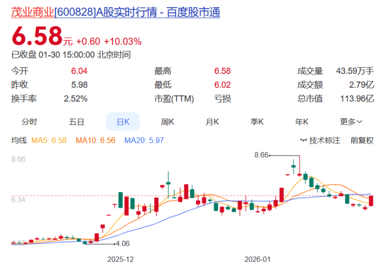 茂业商业报收6.58元,日涨幅10.03%(涨停),换手率2.52%,月涨幅12.67%,今年以来涨幅12.67%。