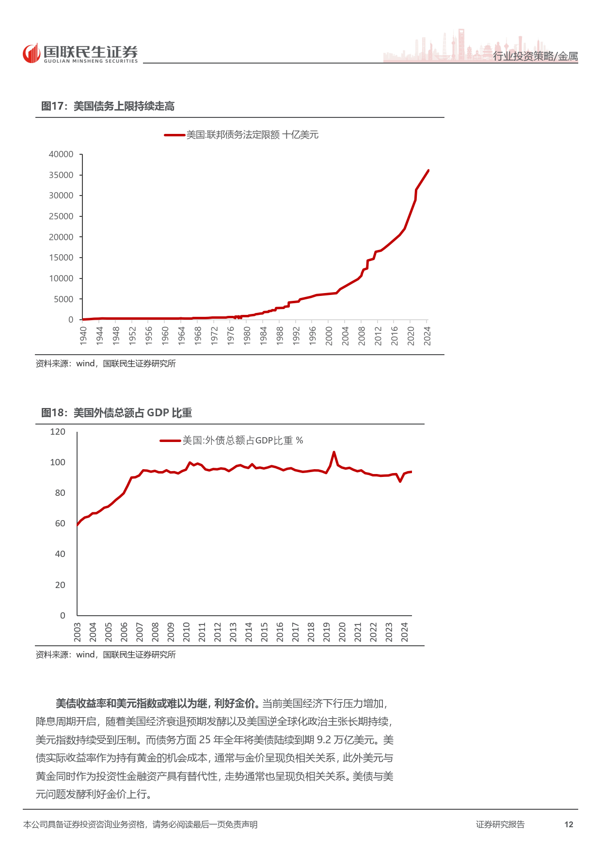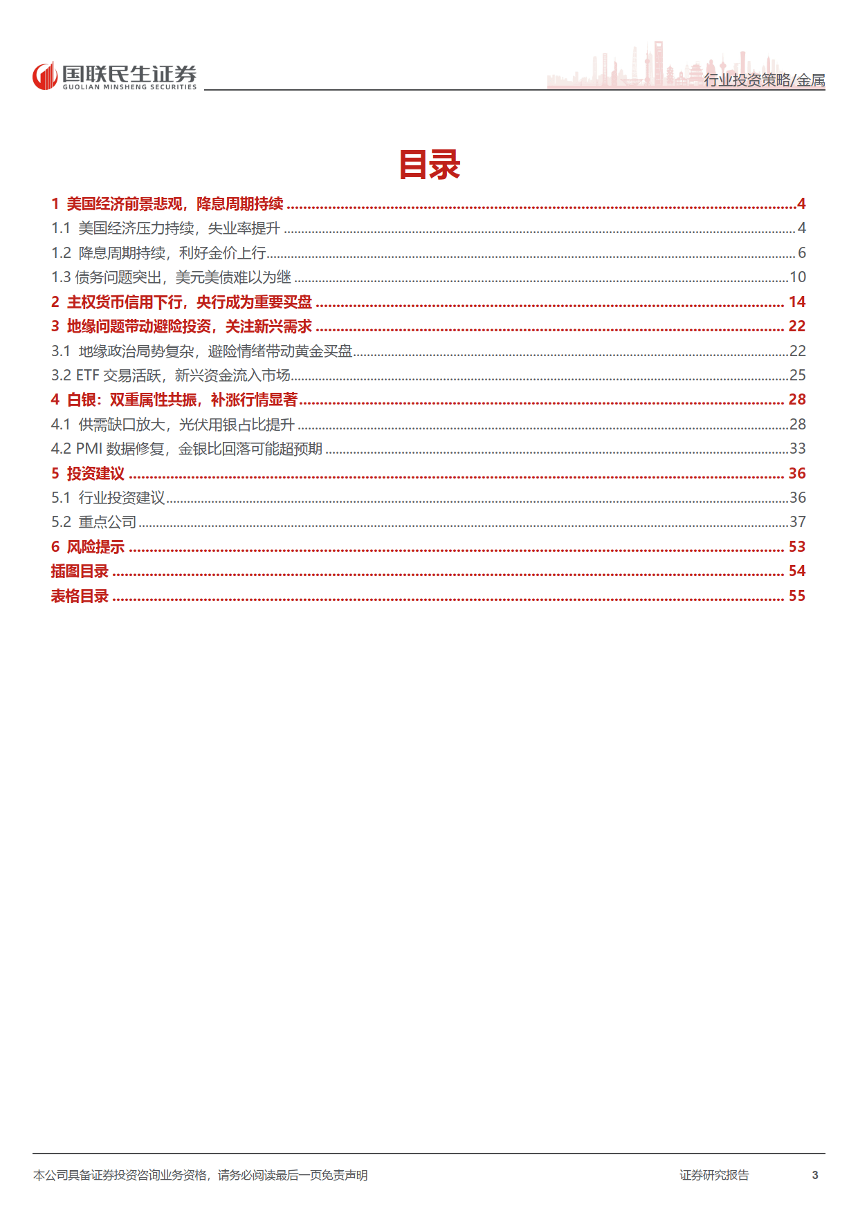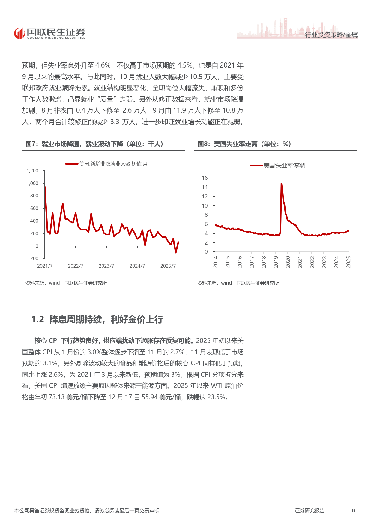 美国经济下行压力凸显,需求动能减弱,消费与投资信心指数下滑,失业率攀升至 2021 年 9 月以来新高,PMI 持续低于荣枯线。高利率加剧财政与债务压力,美联储降息周期加速开启,历史数据显示降息后金价大概率大幅上涨,为金价提供强劲支撑。