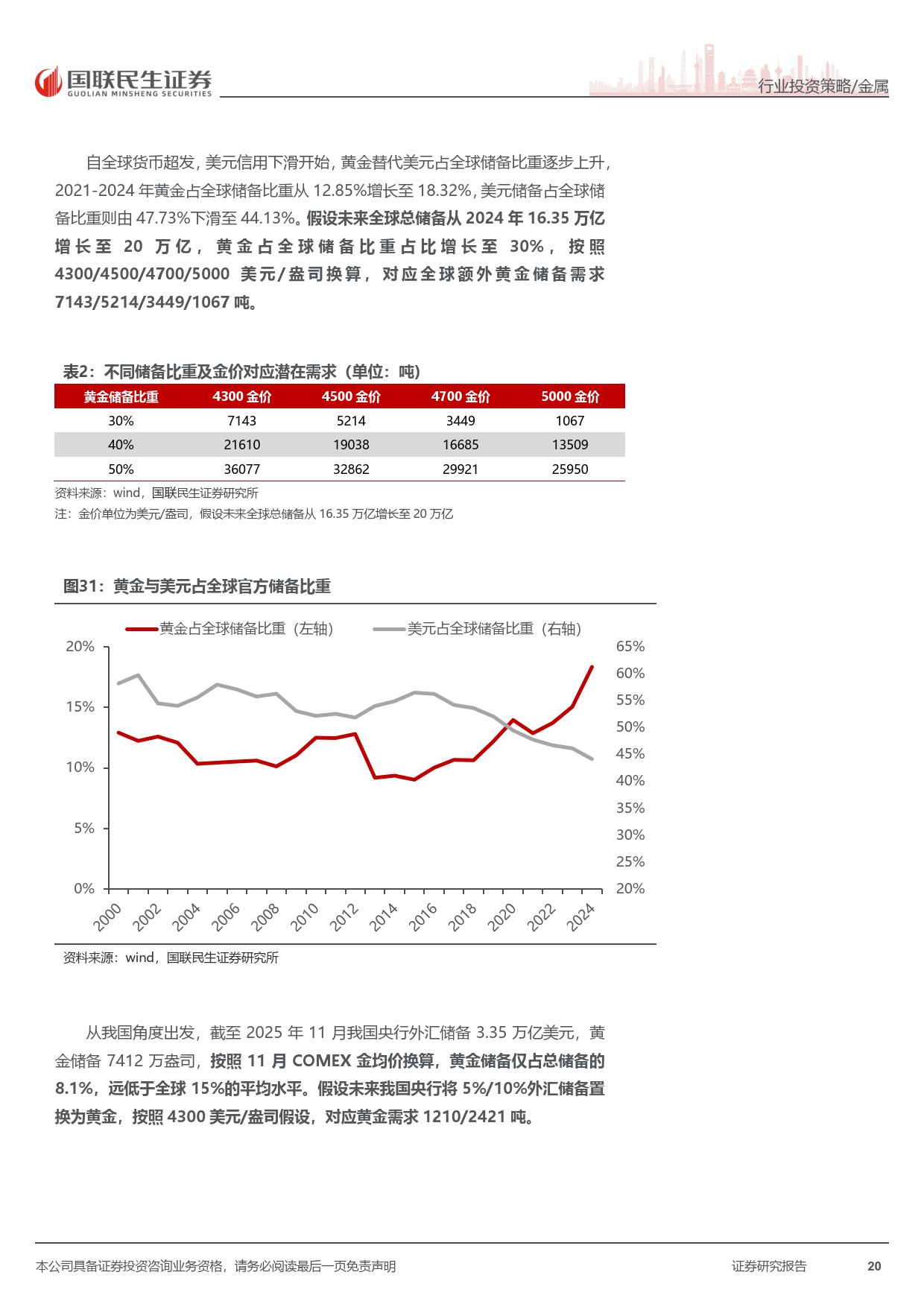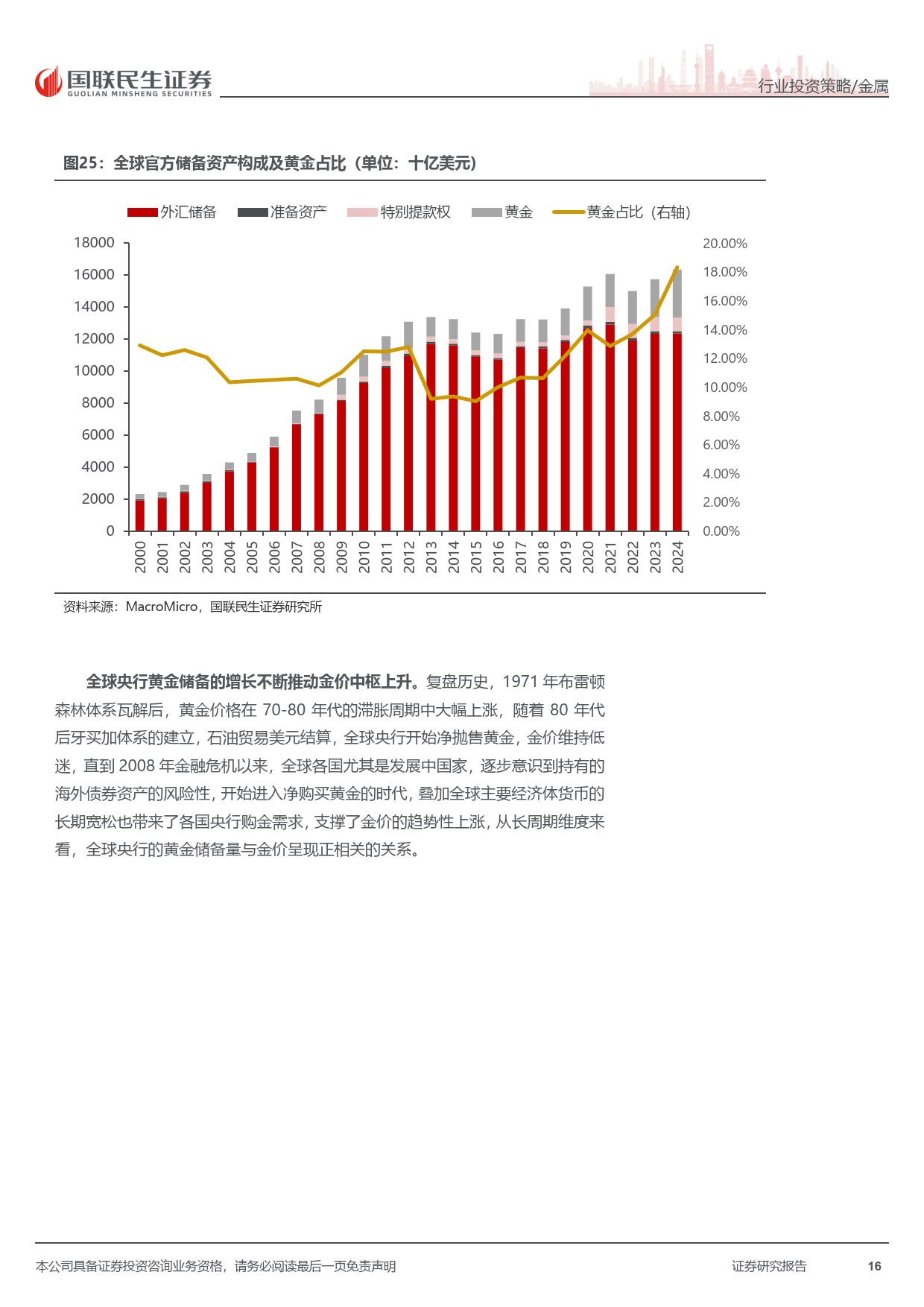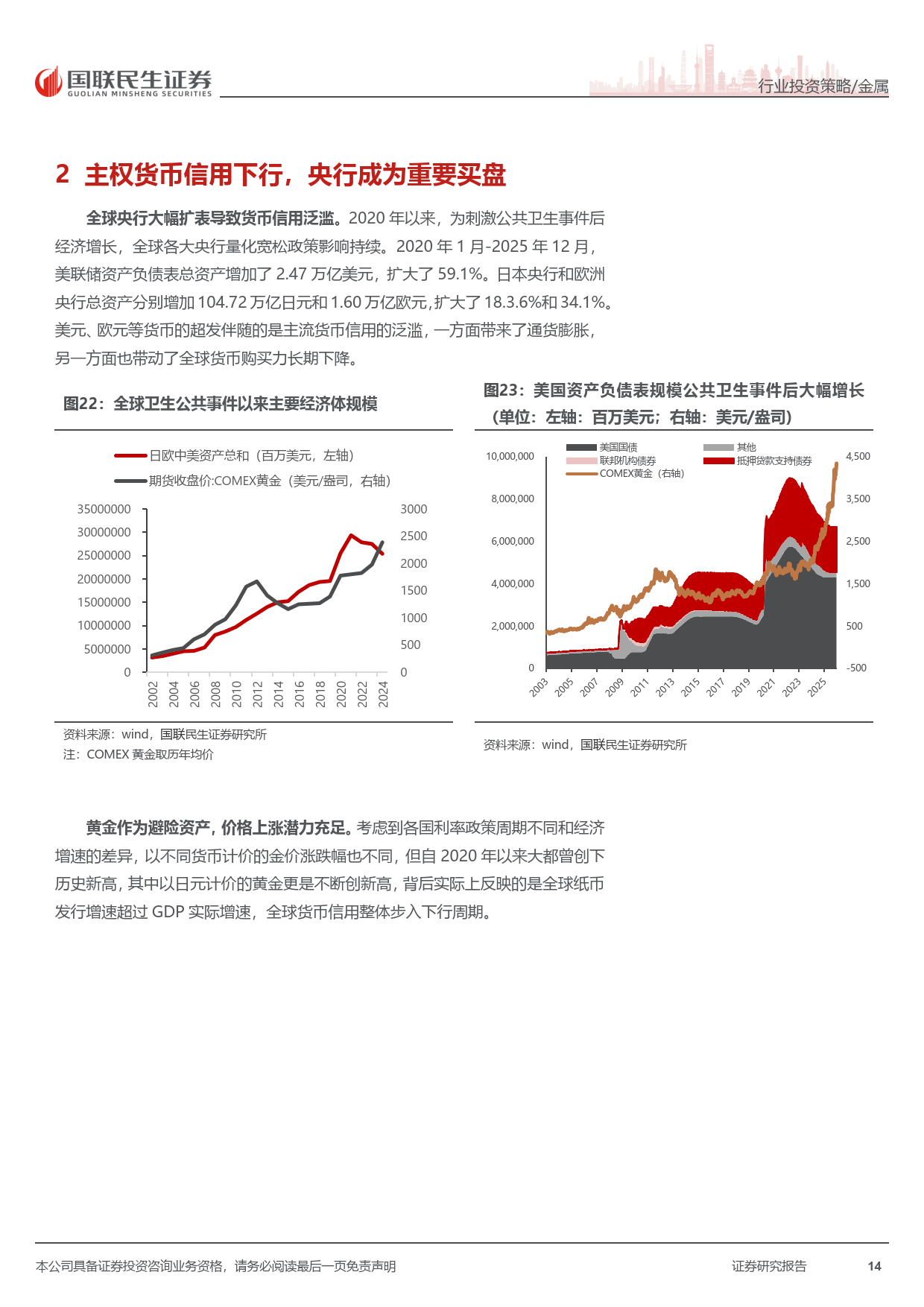 全球主权货币信用下行,公共卫生事件后各国央行大幅扩表,货币超发推升黄金储备价值。全球央行连续三年购金超千吨,我国央行连续 14 个月增持,黄金在全球储备中的占比持续提升,成为金价中枢上移的重要动力。