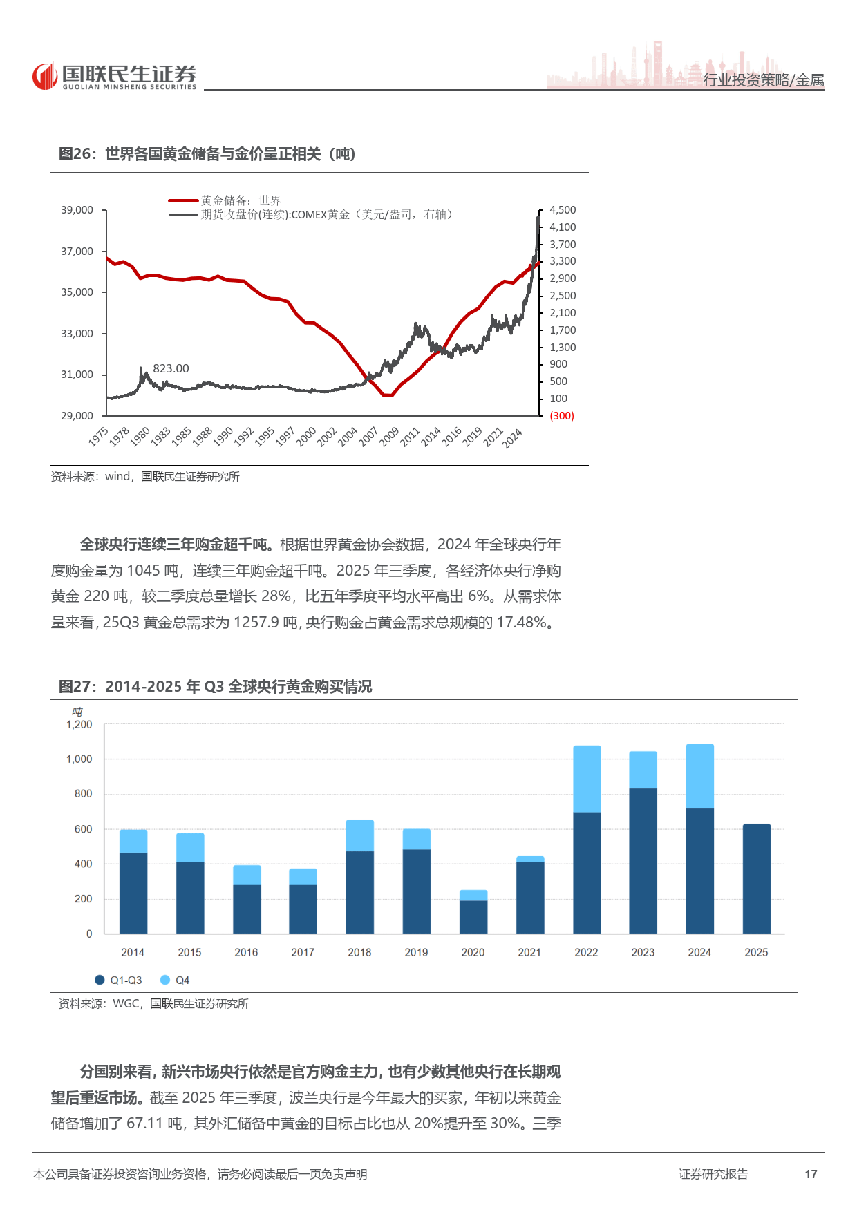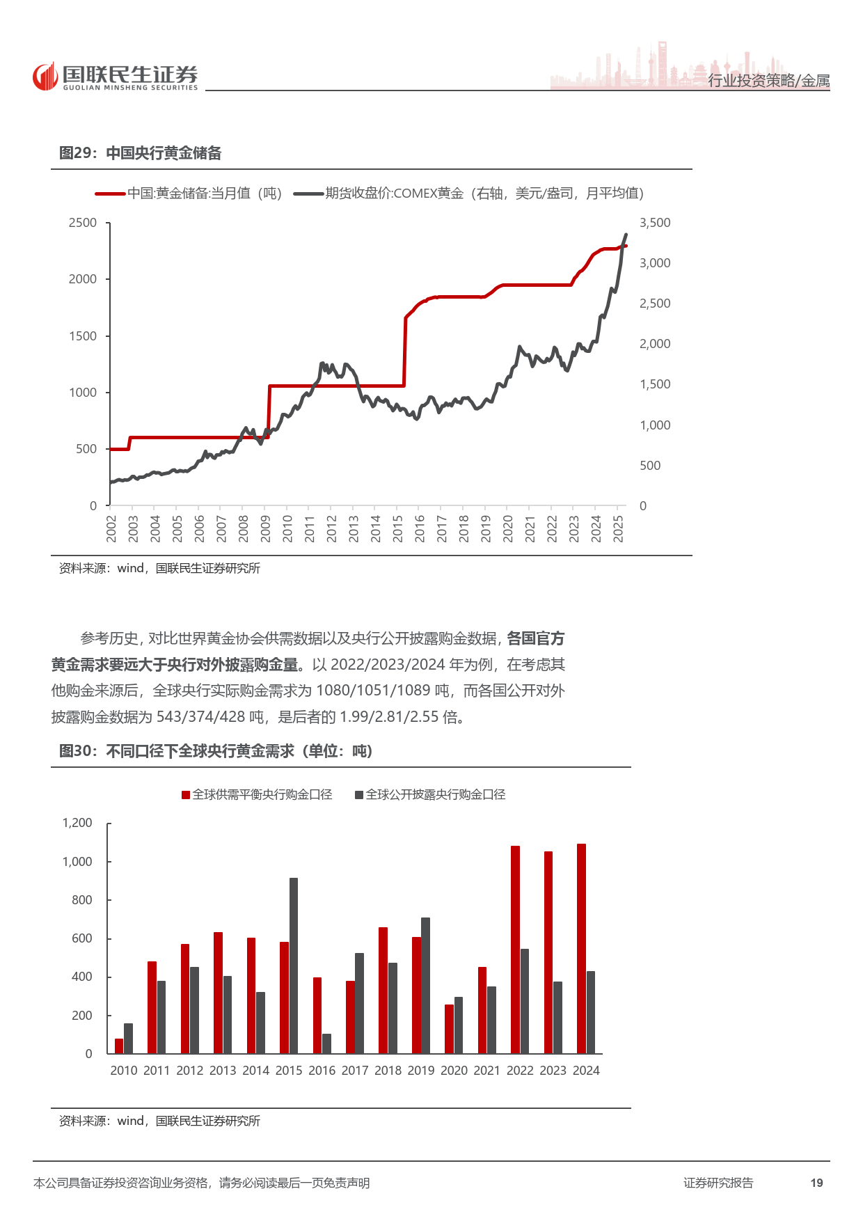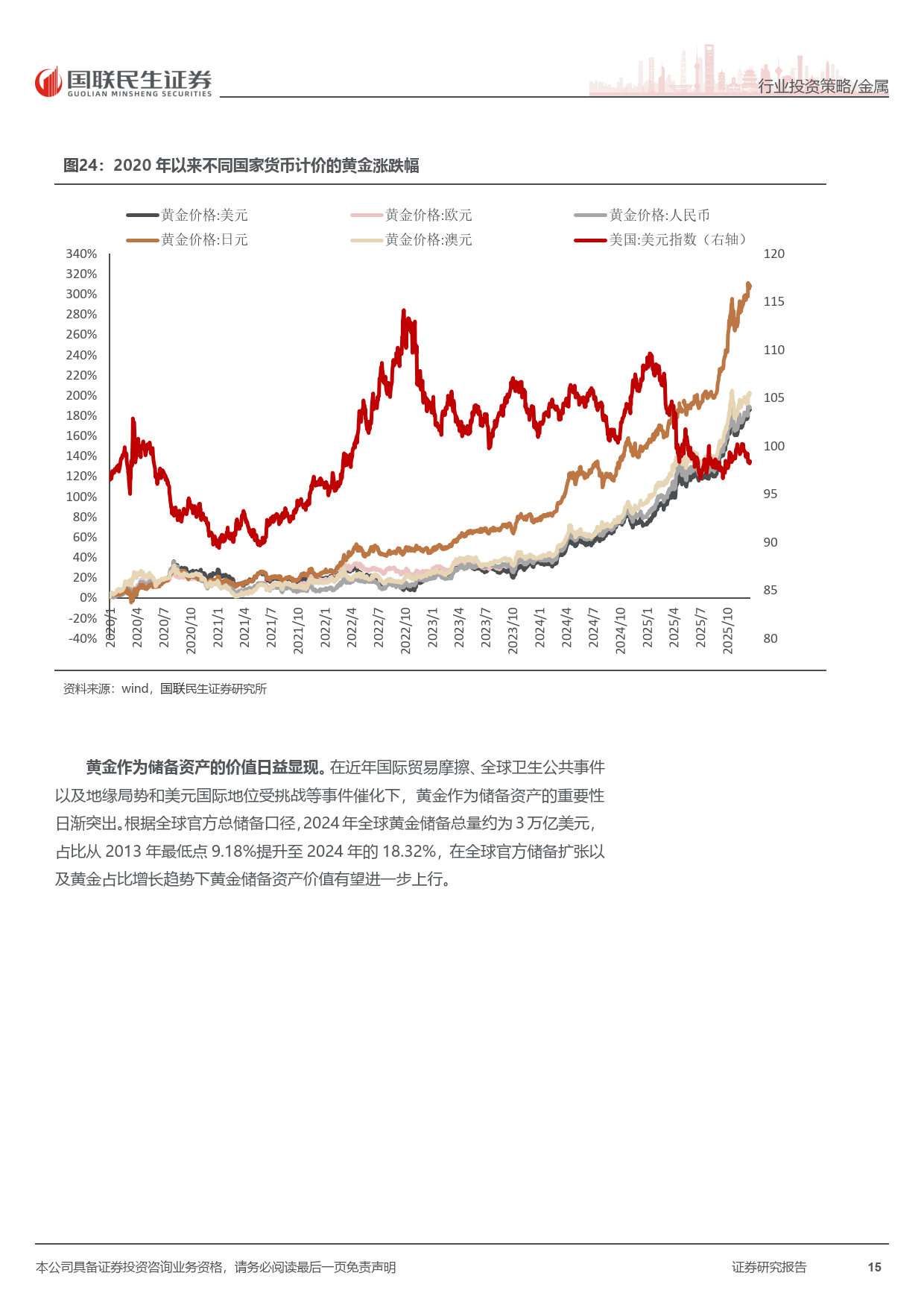 全球主权货币信用下行,公共卫生事件后各国央行大幅扩表,货币超发推升黄金储备价值。全球央行连续三年购金超千吨,我国央行连续 14 个月增持,黄金在全球储备中的占比持续提升,成为金价中枢上移的重要动力。