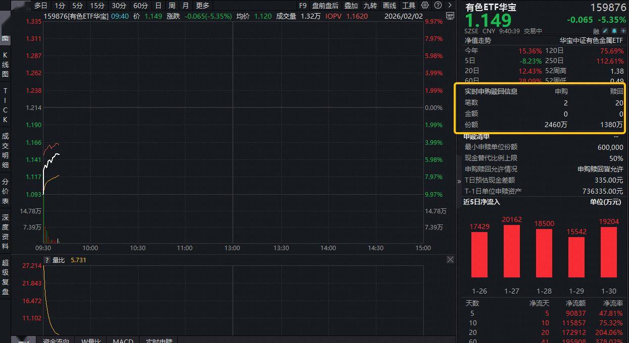 或受金银暴跌扰动,今日(2月2日)有色金属板块延续颓势,有色ETF华宝(159876)开盘场内价格一度跌超7%,现跌5.35%,跌幅略有缩窄。截至发稿,该ETF获资金实时净申购1080万份,或有资金逢跌抢筹!
