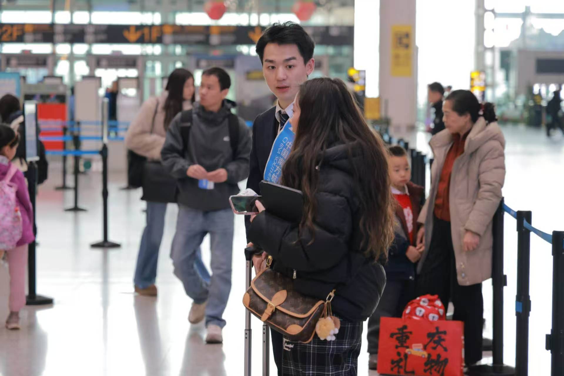 春运期间,重庆航空推出“暖心伴行”服务,在重庆江北国际机场设置特殊旅客专属通道,配备专人协助老人和无陪儿童办理值机、登机等手续,行动不便旅客还可预约轮椅接送服务,确保全程无忧。