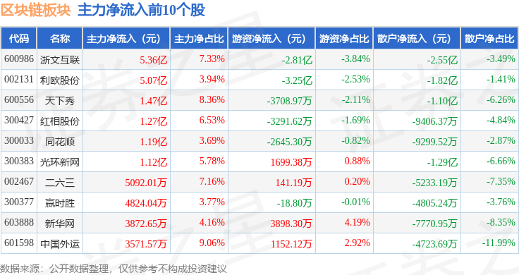 从资金流向上来看,当日区块链板块主力资金净流出63.93亿元,游资资金净流入13.4亿元,散户资金净流入50.53亿元。区块链板块个股资金流向见下表: