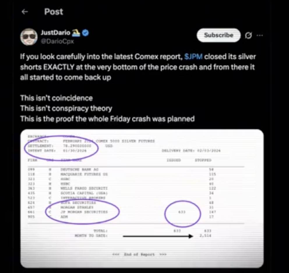 其次是关键机构的同步操作。据他观察,摩根大通(JPMorgan)在周五市场触及最低点时精准平仓了其白银空头头寸。对此他意味深长地表示: