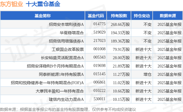 根据2025基金年报公募基金重仓股数据,重仓该股的公募基金共23家,其中持有数量最多的公募基金为招商基金的招商安本增利债券A。招商安本增利债券A目前规模为74.81亿元,最新净值1.8931(2月2日),较上一交易日下跌0.75%,近一年上涨17.32%。该公募基金现任基金经理为滕越 王娟娟。滕越在任的基金产品包括:招商信用增强债券A,管理时间为2017年7月29日至今,期间收益率为38.16%;招商民安增益债券A,管理时间为2020年3月6日至今,期间收益率为36.25%;招商安泽稳利9个月持有期混合A,管理时间为2023年11月14日至今,期间收益率为25.27%。王娟娟在任的基金产品包括:招商招悦纯债A,管理时间为2021年12月31日至今,期间收益率为16.4%;招商安华债券A,管理时间为2021年12月31日至今,期间收益率为14.71%;招商享利增强债券A,管理时间为2022年2月24日至今,期间收益率为9.19%。