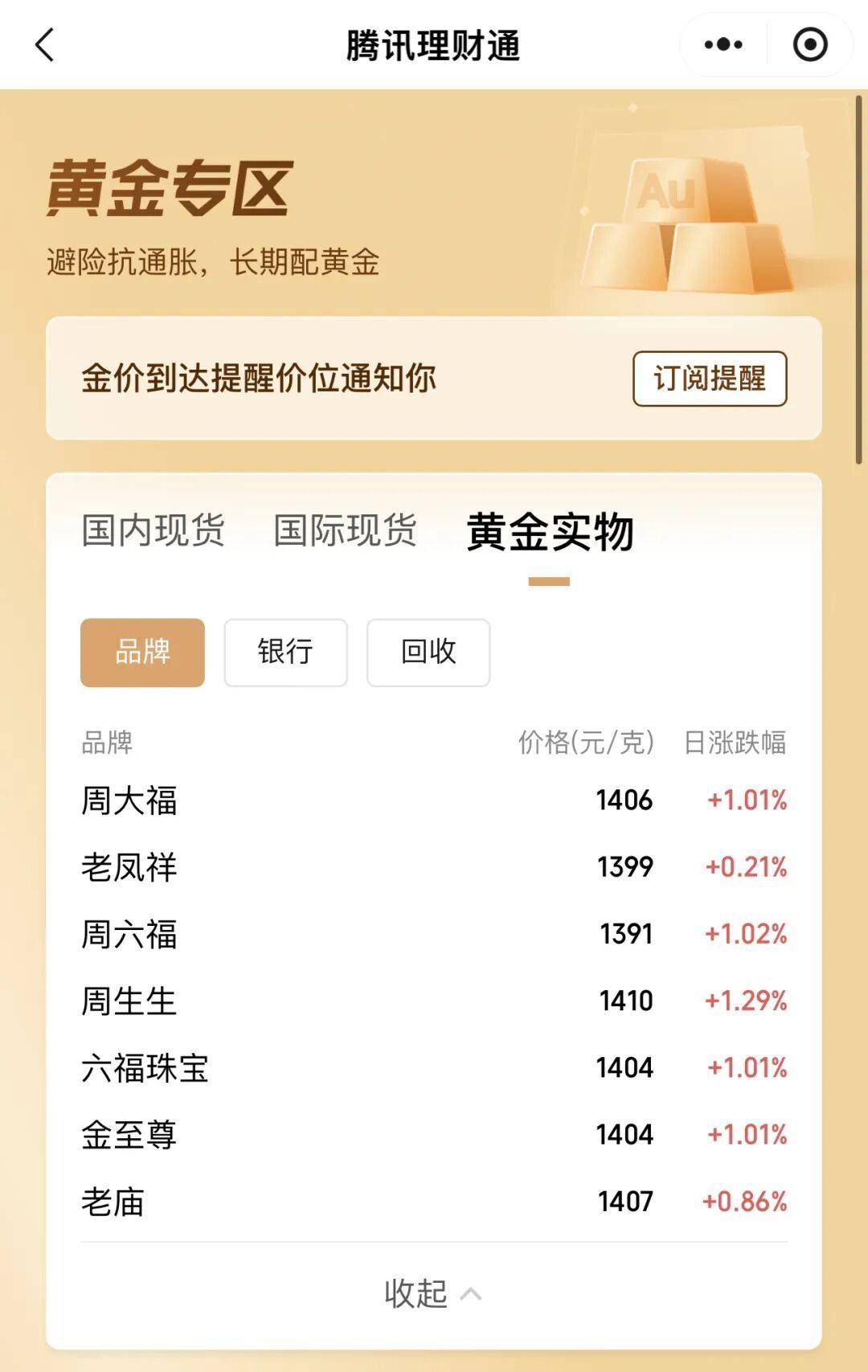 截至发稿,据腾讯理财通数据,多家黄金珠宝品牌公布的境内足金首饰价格延续近期涨势,部分品牌克价超过1400元。