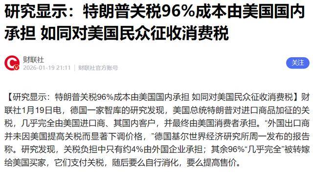 德国一家智库的研究发现,美国加征的关税中,有96%的成本,最终压在了美国消费者和进口商自己的肩上。外国出口商只吸收了可怜的4%。