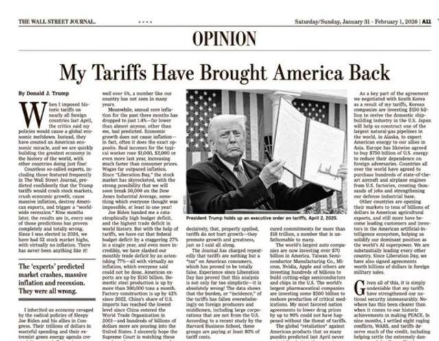 1月30日,美国总统特朗普以《我的关税政策让美国重回正轨》为题,在《华尔街日报》发表署名文章。