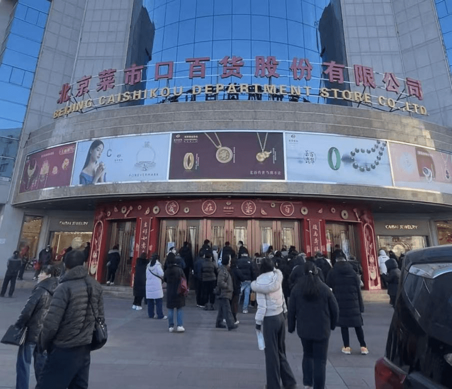 2月3日早上9点20分左右,北京菜百商场还未正式开门,门前已经挤满了前来买金的消费者。一位工作人员透露,回收黄金的消费者已经从侧门进入商场内部排队。新京报贝壳财经记者姜樊 摄