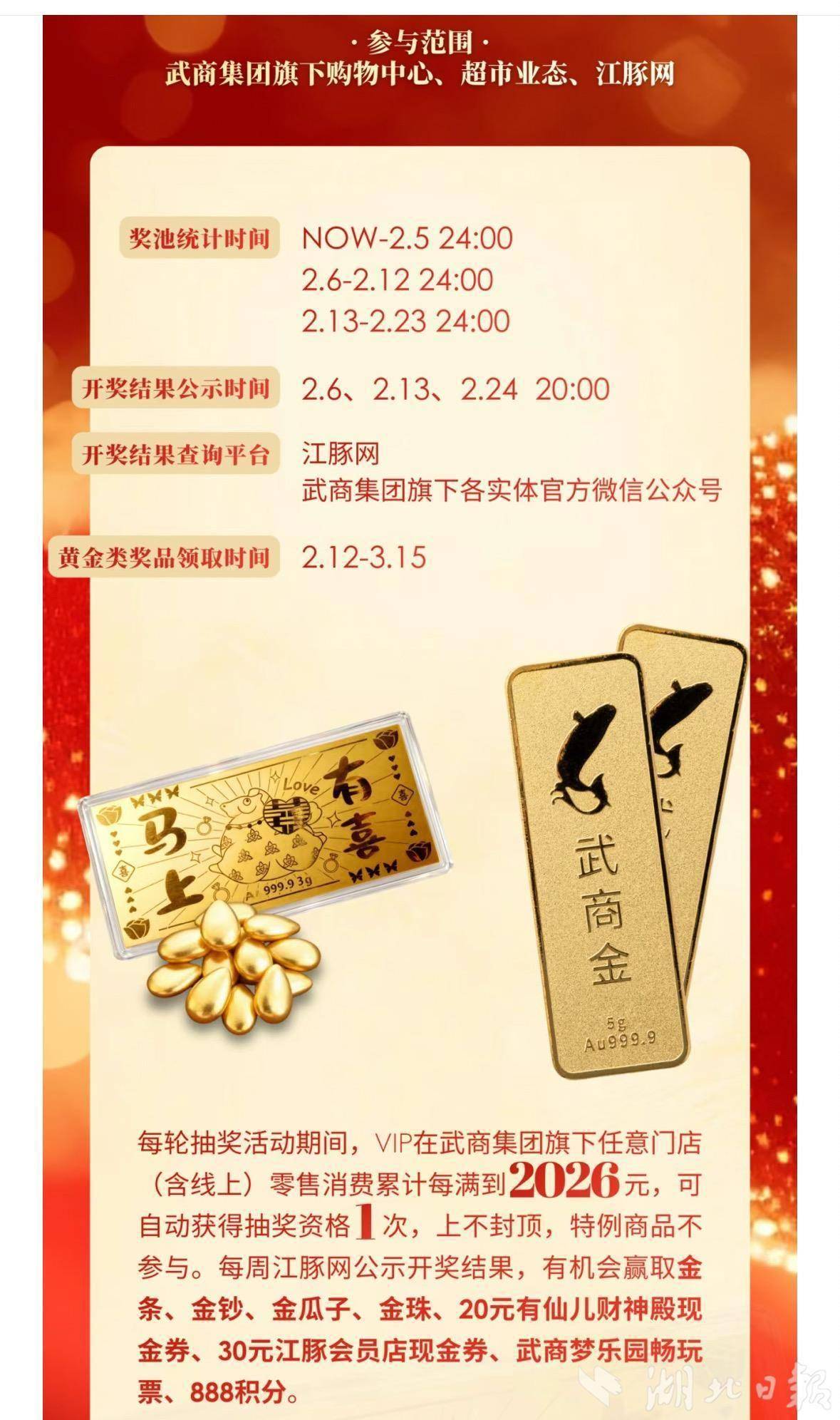 据了解,2026年“来武商 抽黄金”活动覆盖武商集团旗下购物中心、超市业态及江豚网线上平台,活动将持续至2月23日,分三期滚动送出黄金好礼。其中,第一期奖池统计时间为1月30日至2月5日24:00,2月6日20:00将正式公示首期开奖结果;后续两期分别在2月6日-12日、2月13日-23日统计奖池,开奖时间为2月13日、2月24日20:00。