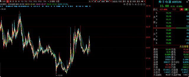 笔者发现,该基金在2021年3季度买入185.76万股的帅丰电器,2021年4季度持有180.00万股。2022年1季度持有190.00万股,2022年2季度持有120.00万股,2022年3季度持有60.00万股,到了2022年4季度所持股票已清仓。然而,在该基金持有期间,在2021年7月1日-2022年12月30日股票价格下跌了24%。