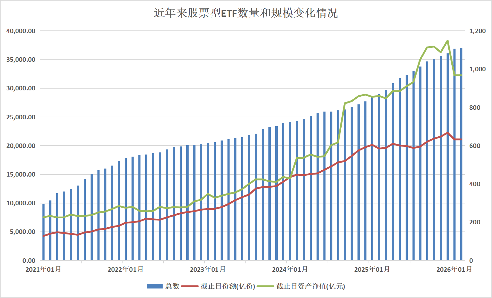 从月频数据来看,股票型ETF资产净值在2022年11月成功突破1万亿元,至2024年7月站在2万亿元上方,“9.24”行情启动以后,其资产净值加速增长,截至2025年12月底刷出3.83万亿元的历史新高。今年以来虽然有所回落,不过截至1月底,股票型ETF的资产净值依然维持在3.23万亿元。