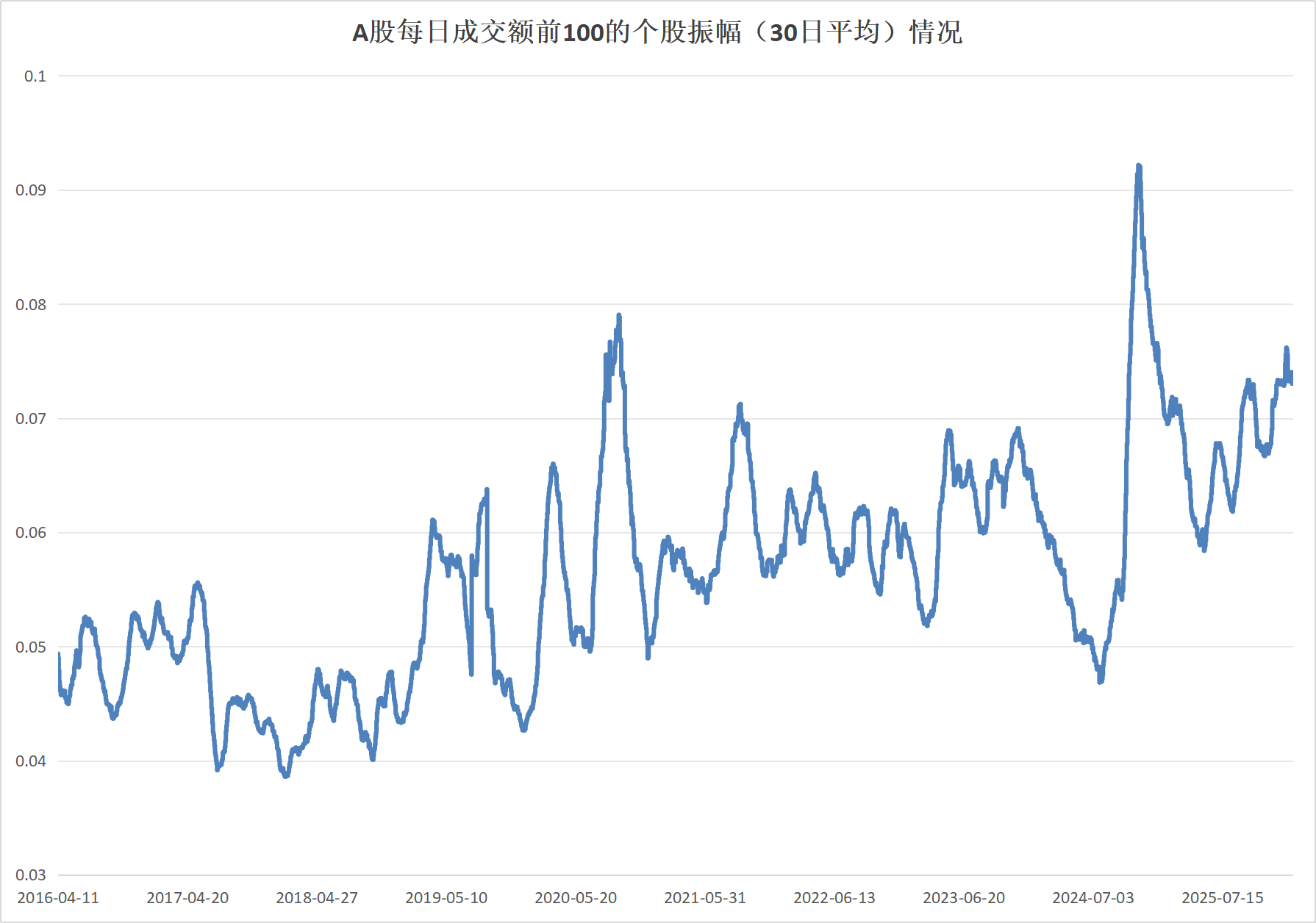 图:A股每日成交额排名前100的个股振幅(30日平均)情况数据来源:Wind、界面新闻整理