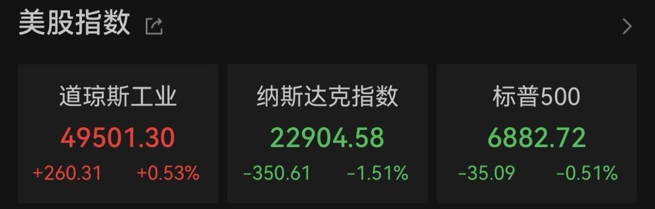 当地时间2月4日,美股三大指数收盘涨跌不一。Wind数据显示,截至收盘,道琼斯工业指数涨260.31点,涨幅为0.53%;纳斯达克指数跌350.61点,跌幅为1.51%;标普500指数跌35.09点,跌幅为0.51%。