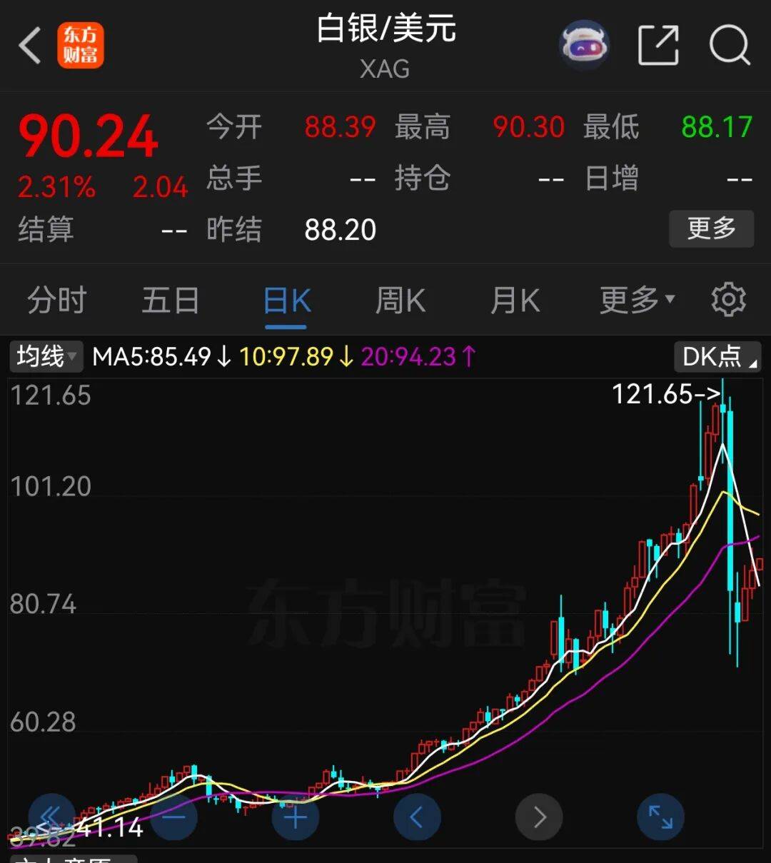 现货白银向上触及90美元/盎司,日内涨2.31%。
