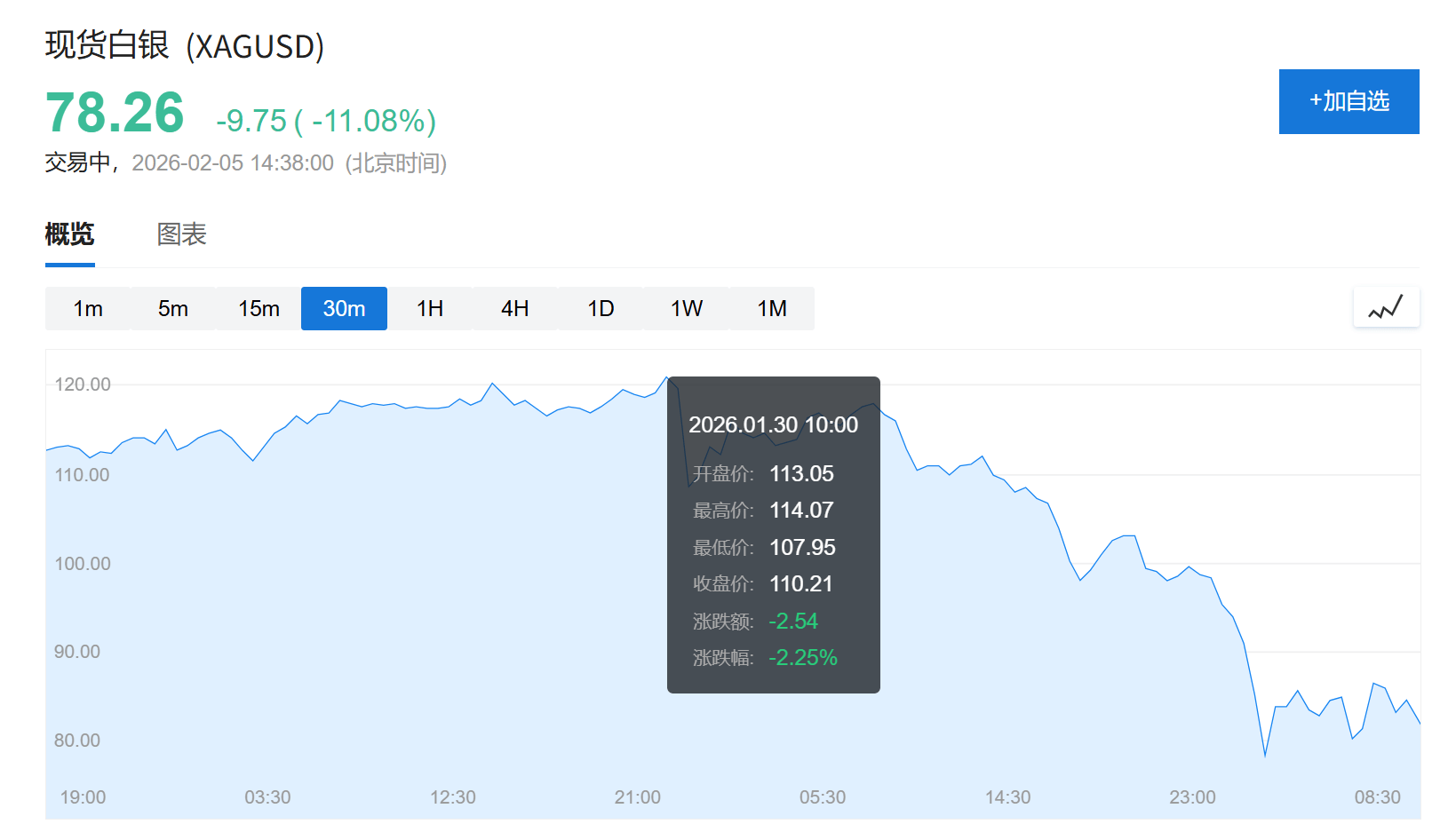 沃什的提名是在美国东部时间下午1:45(北京时间2月1日凌晨1点45)宣布的。然而,白银的崩盘早在30日上午10:30就开始了。在消息公布前的三个多小时里,白银价格已经暴跌了27%。