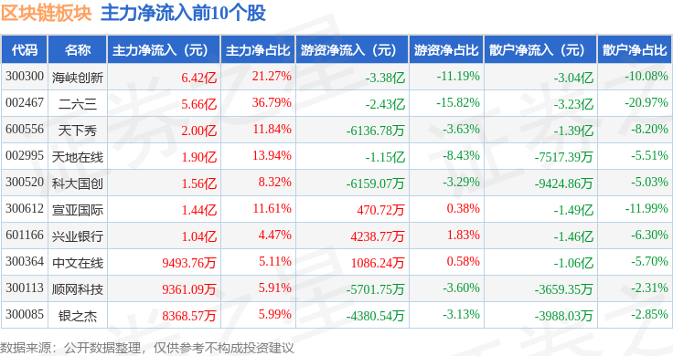 从资金流向上来看,当日区块链板块主力资金净流出32.64亿元,游资资金净流入2.46亿元,散户资金净流入30.18亿元。区块链板块个股资金流向见下表: