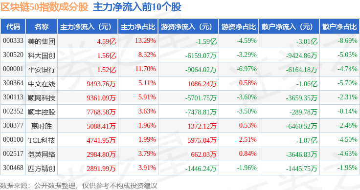 资金流向方面,区块链50(399286)指数成份股当日主力资金净流出合计13.99亿元,游资资金净流出合计2.53亿元,散户资金净流入合计16.52亿元。成份股资金流向详情见下表:
